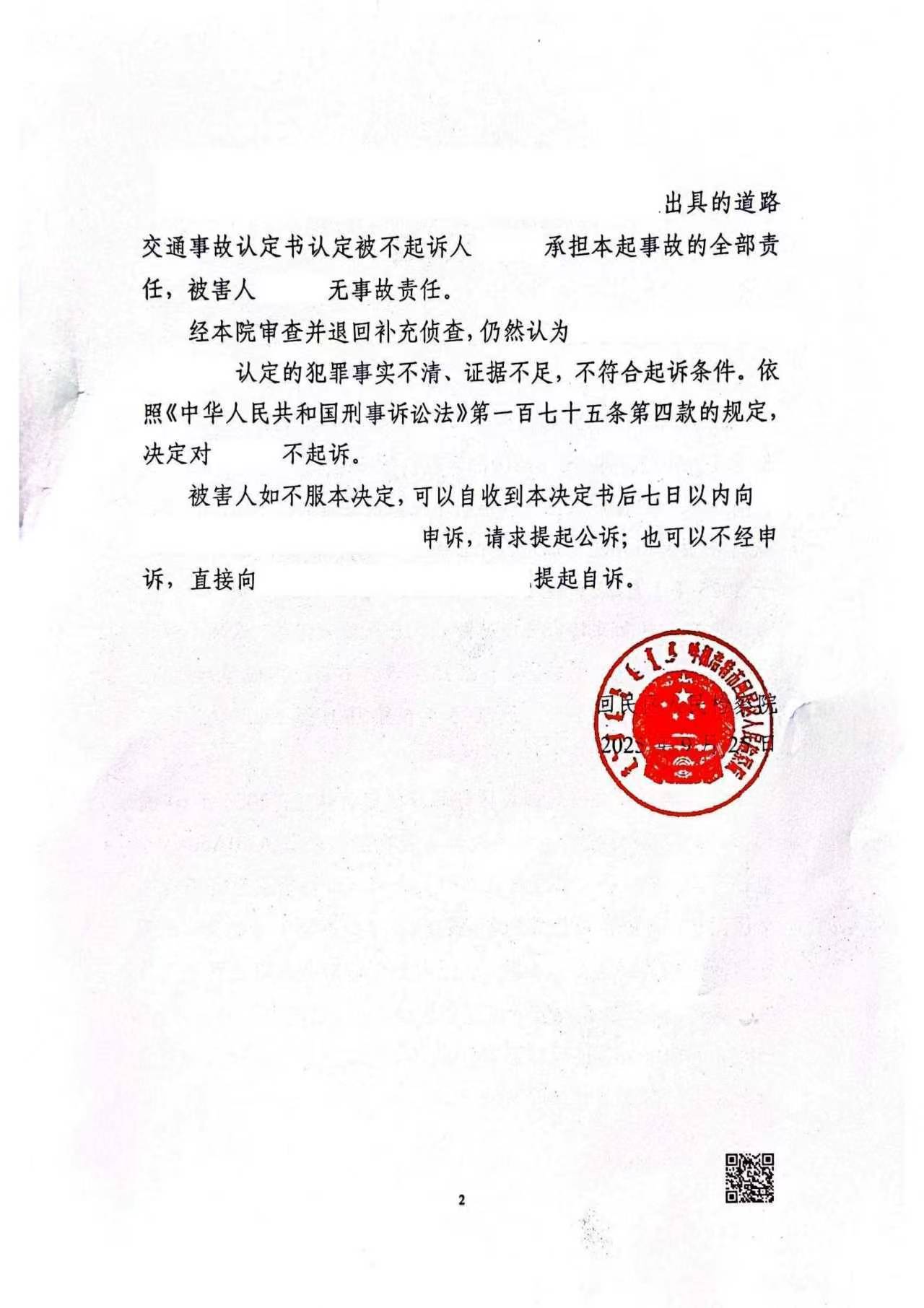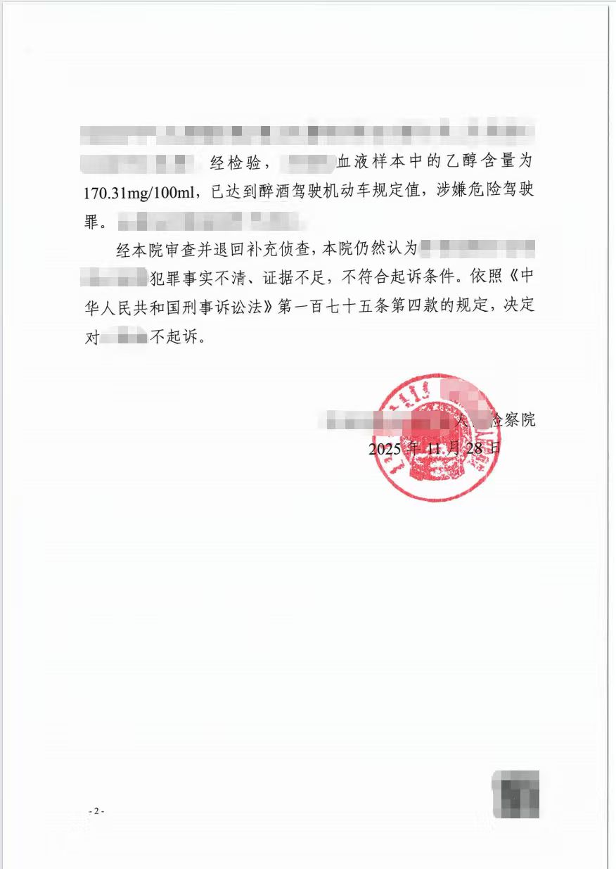 二、王某乙醇含量170.31mg/100ml,发生事故负全责,经二次退补,因事实不清、证据不足,获存疑不起诉。