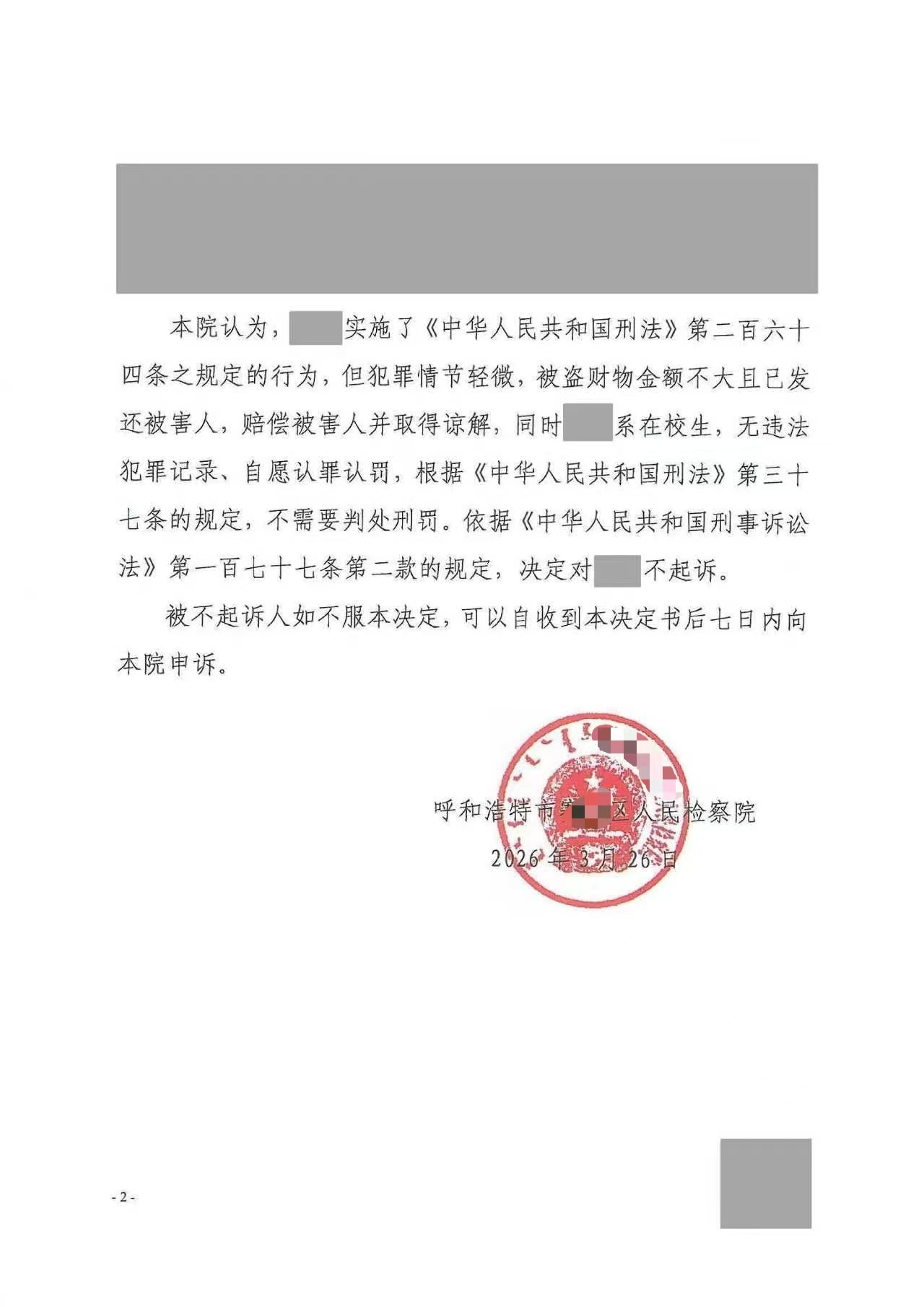 近日,一份来自呼和浩特市某检察院的不起诉决定书,让我们心生感慨,也真切感受到司法力量中最温暖的底色。一份决定,关乎一个年轻人的未来;一次抉择,彰显着法治背后的人文关怀。